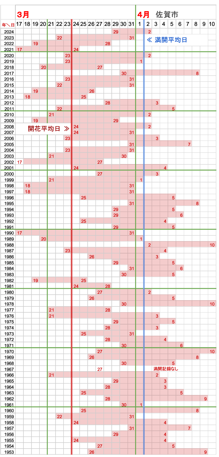 - 気象庁のHP さくらの開花日 さくらの満開日 による 1953~2024年のデータ