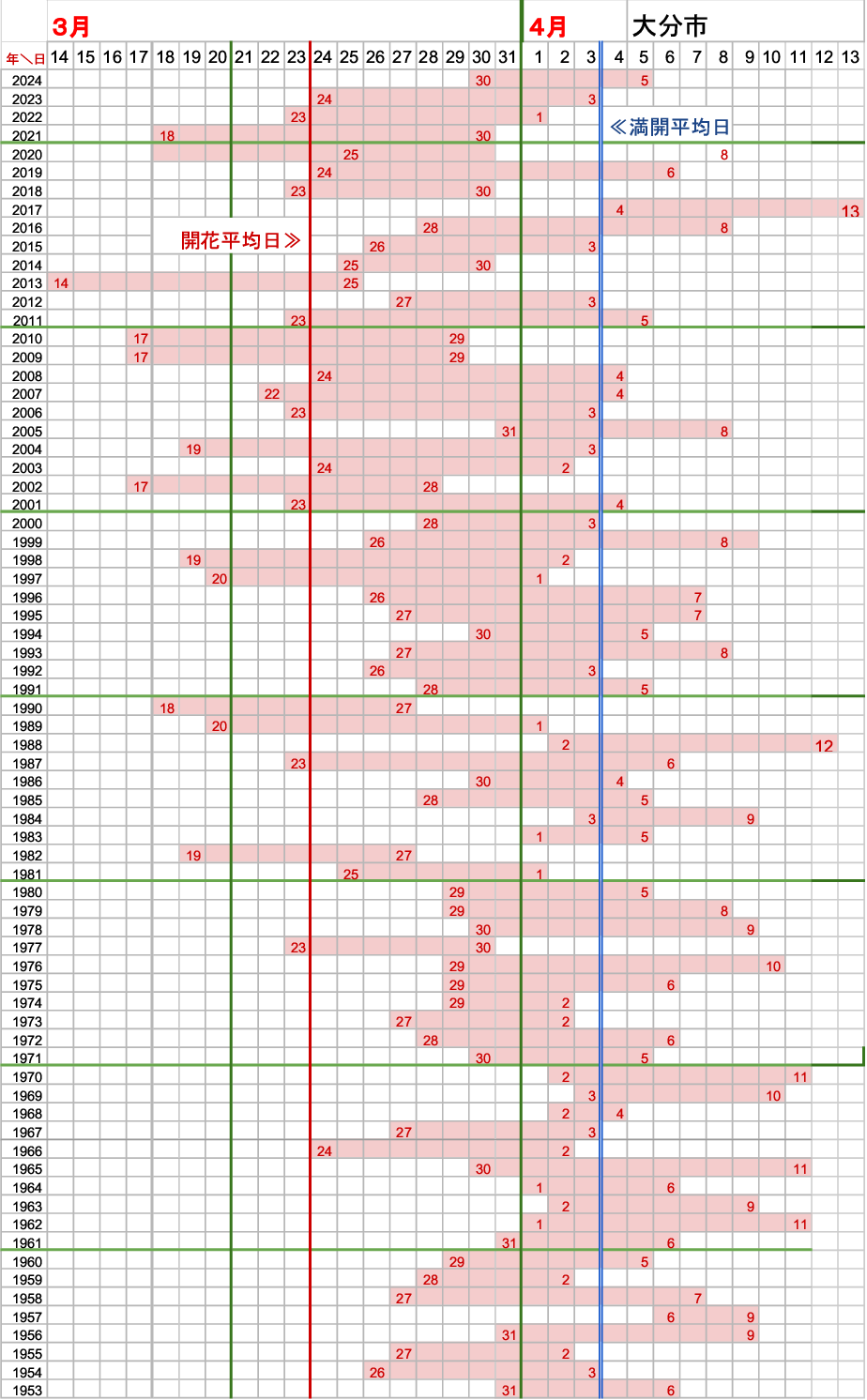 - 気象庁のHP さくらの開花日 さくらの満開日 による 1953~2024年のデータ