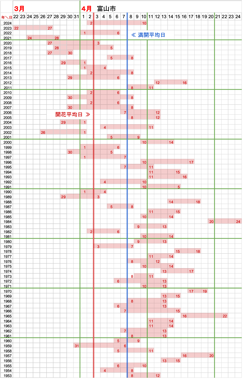 - 気象庁のHP さくらの開花日 さくらの満開日 による 1953~2024年のデータ