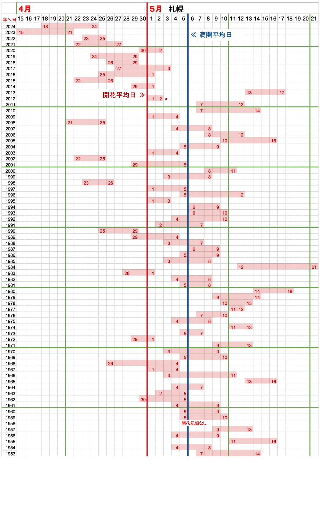- 気象庁のHP さくらの開花日 さくらの満開日 による 1953~2024年のデータ