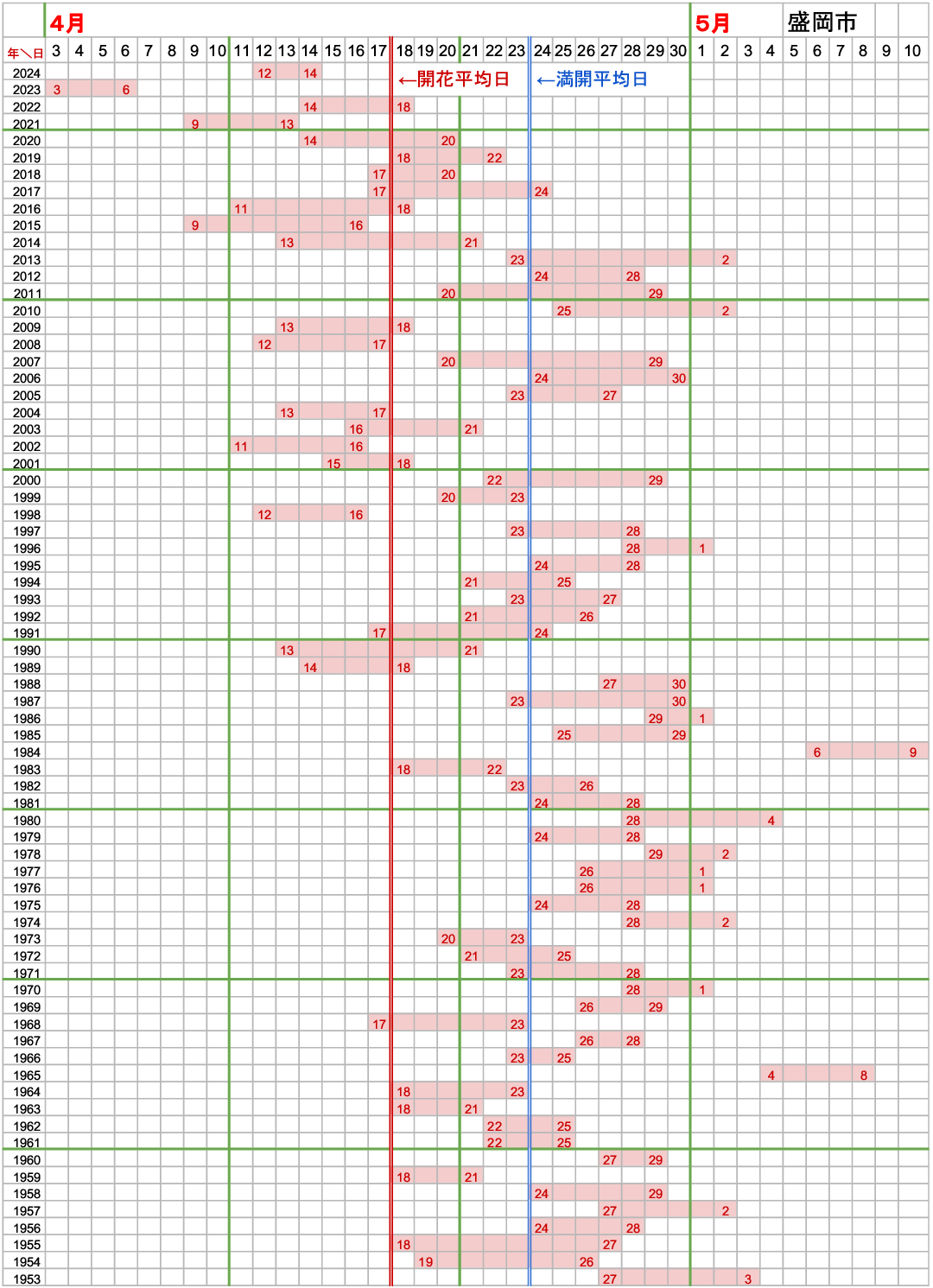 - 気象庁のHP さくらの開花日 さくらの満開日 による 1953~2024年のデータ
