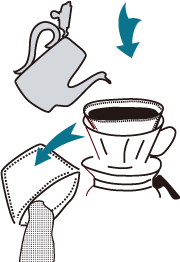 - 「ギュッと握って絞る」について……最近使い出した表現です。ネルフィルターが含んでいる水分は出来るだけとりたいですが、ねじって絞ると、生地を傷めるように思って、片手でギュッと握って絞り、その後乾いたタオルで包んで、上からたたくか、タオル自体を絞るかが、かうひい屋での方法でした。