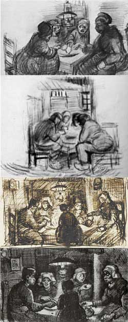 ゴッホはここ数年間、ミレーや、ゴッホ自身が「オランダのミレー」と尊敬するジョゼフ・イスラエルの影響を受け、ニューネン(Neunen)の村周辺で村人や生活のスケッチを繰り返して「農民画家」として修行を積んできました。そして「ジャガイモを食べる人々」はその集大成の意味を持っていました。