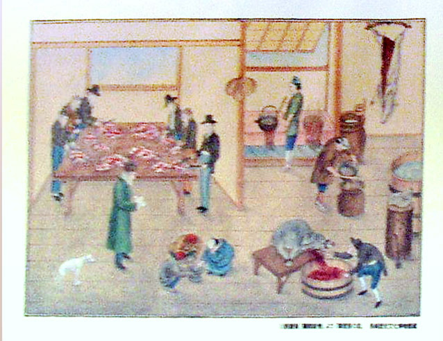 手前右では、豚の解体が始まり血を出しているところです。左では日本人を含む東洋人らしき3人が乳鉢を使ってなにやらすり潰しています。奥の方左手では6人の西洋人が肉を調理しています。右手奥では竈(かまど)で煮炊きしている人がいます。スープを漉し取っている人もいます。 もう少しきれいな写真だとよかったのですが。