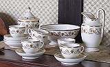 テーブルの上にはカップの他、シュガーポット、ボール、ミルクピッチャーとおぼしき磁器、そして右側には背の高いポットがあります。