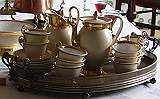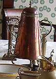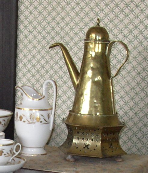 手前のお盆にはカップ、シュガーポット、ピッチャーの他、磁器製のポットもあります。後ろのポットも秀逸です。左奥に写っている、室内用の湯沸かし?も見逃せません。