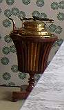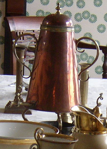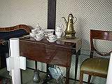 このテーブルもポットが面白いです。二つの取っ手を持って、両手で抱えるタイプですね。ポットと言うより配給器、ディスペンサー………何というのでしょう。足が3本あります。その下にアルコールランプかローソクを置いて加熱するようになっています(ポットの下の黒い部分)。