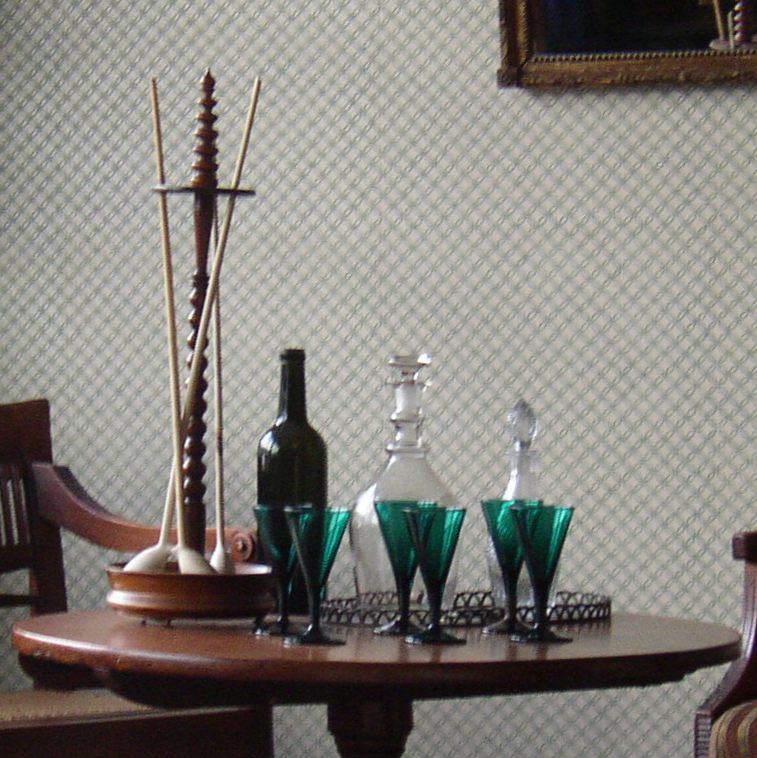 先ほどのテーブルの反対側の窓際に素敵に飾られた酒器セット。あまり写っていませんが、椅子が同じセットではなく、デザインがバラバラなのは復元のご苦労なのかも知れません。