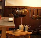 ピントが怪しいですが、右側に2本ほど写っている杓子(しゃくし)。右の方にあと3本ありましたが、なぜか全部網杓子(あみじゃくし)でした。鍋、包丁、壺、ビン、大鍋などがあります。 杓子の左にかかっている棒状のもの、これは洋包丁を研ぐ道具ではないかと思いました。