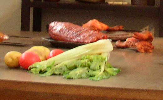 テーブルの奥の方、一見魚に見えましたが、やはり肉類のようです。手前の方にある野菜類は、ジャガイモ、セロリ(家内の推測)、トマト………。