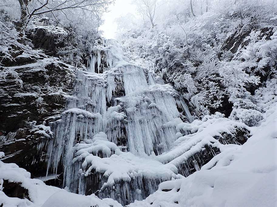 日本に氷結する滝は他にもたくさんありそうですが、この時の「四王寺の滝」の美しさは、滝のつららが織りなす繊細さと、雪をかぶった周囲の草木の姿とが一体となって、まさに絶景を作り出していました。