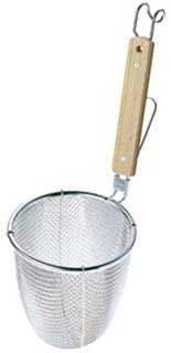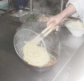 麺の茹で方は、最近は上の写真のような「てぼ」と呼ばれる網に一人分を入れて茹でる店が多くなりましたが、伝統的なスタイルにこだわる店では、大釜の湯の中に人数分の麺を全て入れて、下の写真のような平たい網ですくい上げ、湯を切って、お客さんの丼に取り分けます。