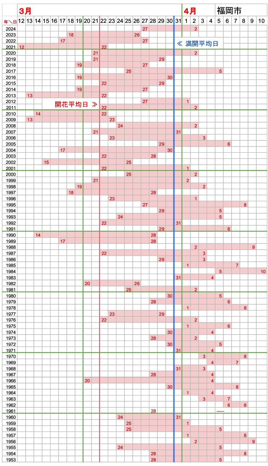 - 地域の気象台が定めた標本木による観測値。5~6輪咲けば「開花」、80%以上が咲けば満開とする。福岡の標本木は、福岡管区気象台がある福岡市中央区。